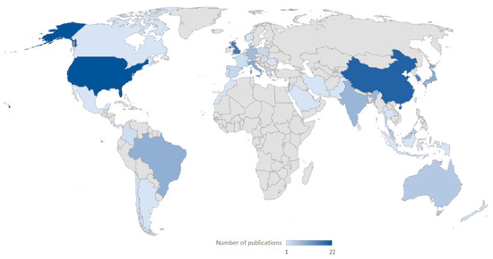 Figure 4 shows the countries that have researched and published on thermal comfort. A light shade is observed for those countries in which fewer articles have been published, starting from a single publication, and a darker shade for those in which more research has been carried out, reaching a maximum of 22 publications. Thus, the countries with the highest scientific production on this subject are the United States, China, and the United Kingdom, with 22, 20, and 17 publications, respectively.