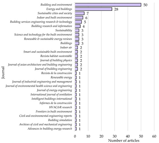 Figure 5 shows the number of articles published by the journals identified in this study. In this way, it is possible to evaluate the impact generated by thermal comfort research in the different disciplines. Of the 138 articles selected, a total of 30 journals were identified, covering research areas focused on engineering and architecture, sustainability, and energy, among other research areas. However, within these categories, it is also possible, to a lesser extent, to find journals that focus on evaluating the impacts of thermal comfort on occupants’ health. This shows that the research focuses analyzed in the articles considered in this work cover a broad spectrum of disciplines, leading to a comprehensive review of TCVs. The literature review provides many studies from which conclusions could be generalized, and certain recommendations for future work could be made.