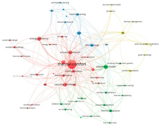 Figure 6 shows the map of co-occurrence of keywords, where each node with its respective label represents a keyword, and its size reflects the number of occurrences it had in total; the larger it is, the higher its frequency. The centrality reflects the most influential nodes within the network since they are the ones that present a greater amount of co-occurrence with another term within the network [19]. Thus, the central domain of the research is found in the thermal comfort term, being the node with the largest size and centrality within the network. With this, it is concluded that the main research area that unifies the whole network is thermal comfort and the research branches taken for its evaluation. On the other hand, the color of each node represents the grouping that VOSviewer delivers, which is called a cluster [19]. Figure 6 shows a total of four clusters represented by four different colors: the red and blue clusters correlate with energy efficiency that interrelates thermal comfort and energy optimization strategies using machine learning; and the yellow and green clusters focus on operational strategies and behavior perception.
