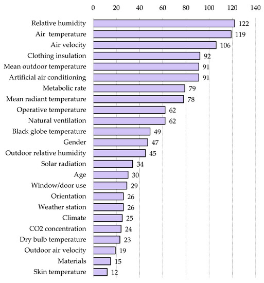 In Figure 7, the TCVs were ordered based on their frequency in the items in descending order. Thus, indoor relative humidity, air temperature, and air velocity are visualized as the TCVs with the highest occurrence within the set of articles. On the other hand, skin temperature and materials are the least frequently occurring TCVs. However, since most of the analyzed documents correspond to field studies, it is observed that many of the variables present in the literature correspond to environmental ones, where they can be presented with another denomination, as discussed in the previous section. Variables such as dry bulb temperature, globe temperature, or operative temperature were not unified and were searched under their denomination. However, it is important to note that they represent the same concept of “operative temperature” as required in the ASHRAE55 standard for measuring thermal comfort [36].