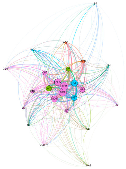 To conclude this stage, the network diagram of the TCVs was represented using Gephi software, together with the network metrics generated, so that it was possible to carry out a qualitative study by obtaining the most central variables and thus analyze those that were most influential within the network.