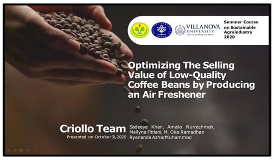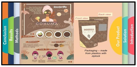 During the following stage, the participants were asked to review their project charter to include desirable, feasible, and viable aspects of sustainability []. One of the project groups reported that their project was desirable because the project would reduce waste and generate alternative income for farmers. They claimed their project was feasible because of the continuous availability of raw materials and the antioxidant content in organic compounds. They considered that the product would benefit the health of users. This step confirmed how confident the students were about their project proposal (see Figure 2).