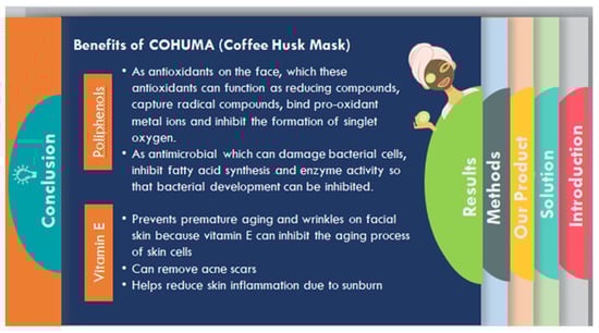 The participants developed many project plans through the program, including one called COHUMA (Coffee Hush Mask). The group created an innovative face mask made from coffee husks to reduce acne-causing bacteria, disguise black spots, and provide an anti-aging effect on the face. In addition to using coffee husks as the main ingredient and to maximize the performance of the mask, the participants added vitamin E to moisturize, soften, and brighten the facial skin and to fade acne scars. The product design can be seen in Figure 3 and the instructions for use can be seen in Figure 4.