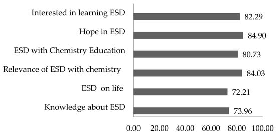 Teachers’ and students’ knowledge of ESD was vaguely informed in the theoretical sense, and only a few of them possessed any clear theory-supported concept of either sustainability or ESD []. Education settings need to become more proactive in sustainability, and to make that happen, ESD needs to be a core concept in teacher education, and its implementation must be obvious in policy, campus practice, research, teaching, and learning [], especially for preservice chemistry teachers. According to [], teachers are the most important factor in education reform. What teachers think, believe, and know will affect their teaching. For this reason, the development of teacher competencies is an essential key to successfully growing the value of ESD in learning.