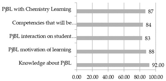 The results of the PjBL questionnaire (see Figure 3) indicate that the participants were knowledgeable about PjBL (92%), PjBL motivated learning, participants understood the relationship to chemistry, and PjBL encouraged students to learn actively. On average, the preservice chemistry teachers were very familiar with the PjBL model. It has positive impacts as project-based learning develops students’ critical-thinking skills more effectively than conventional learning models [], develops students’ 21st-century skills, and develops teachers’ professional abilities in learning and assessing 21st-century skills []. Research conducted by Devkota et. al., [] claims that implementing project-based learning can increase learning motivation and student engagement and change students‘attitudes from passive to active learners.