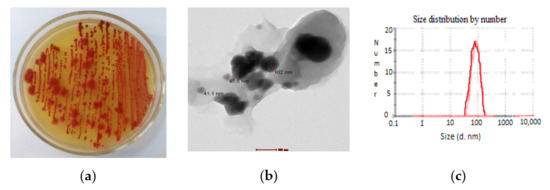 In the current study, 25 selenite-resistant bacterial isolates were screened for the production of Se-NPs by reducing selenite to red elemental selenium. The red color of the colonies on the solid culture is proof of the reduction of selenite to red elemental selenium, which could be observed, and this indicated this reduction of SeO3−2 to red Se0. The isolate TAH was the most efficient compared to other isolates (Figure 2a).