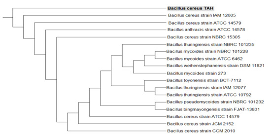 The genomic DNA of bacterial biomass was isolated with a Gene Jet Kit (Fermentas). Then 16S rRNA genes were amplified via PCR (a hybrid thermocycler and the Maxima Hot Start PCR Master Mix) using universal forward and reverse primers (F, 5′-AGA GTT TGA TCC TGG CTC AG- ‘3 and R, 5′-GGT TAC CTT GTT ACG ACT T-3′). The resulting amplified products were eluted in agarose gel, and the 16S rRNA gene was sequenced using an ABI 3730xl DNA Sequencer at GATC Biotech DNA Sequencing, Constance, Germany. Data were analyzed using the BioEdit software 5.0.9 sequence editor. The sequence was aligned by the RDP Sequence Aligner software (https://rdp.cme.msu.edu/, accessed on 21 December 2021). A dendrogram and the tree topology were constructed using the method of neighbor-joining. The bacterial isolate was identified as Bacillus cereus TAH, and the sequence of the 16S rRNA gene was deposited in a gene bank with the accession number MW676031.