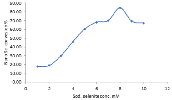 The selenite reduction potential of B. cereus TAH was assayed by measuring the residual selenium concentration in the supernatants at different selenite levels (Figure 5). At a lower concentration of 1.0 mM, only 17% of selenite reduction was achieved within 72 h. The percentage of production of nano-selenium was increased by increasing the concentration of selenite until it reached 84% at a concentration of 8 mM. Afterward, the percentage began to decrease at concentrations of 9 and 10 mM.