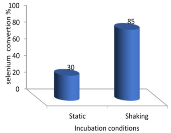 The results show that the incubation under static conditions negatively affected the reduction of selenite compared to incubation under shaking conditions, which led to a conversion percentage about 3 times that under static conditions; this can be attributed to the speed of reproduction and multiplication of bacterial cells under shaking conditions (Figure 6 and Figure 7).