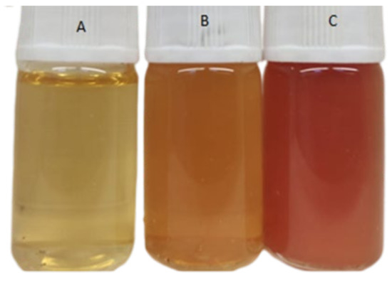 Effect of static or shaking conditions on the production of nano-Se by Bacillus cereus TAH. A: control; B: under static conditions; C: under shaking conditions.
