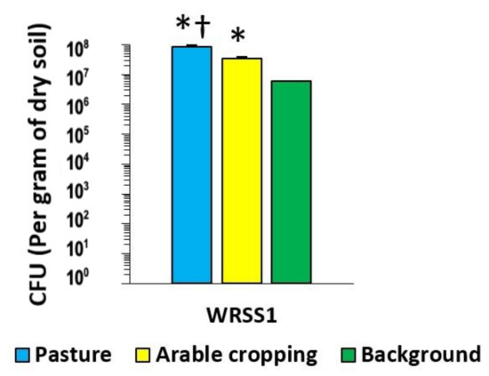 Total number of CFU (per gram of dry soil) from WRSS1 pastoral, arable and background soil samples, on R2A agar. * p < 0.05 compared to background soil bacteria total CFU; † p < 0.05 versus arable soil bacteria total CFU.