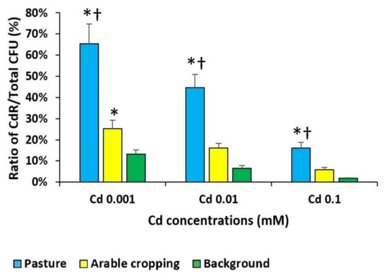 Mean ratios of TEoECR/total bacterial CFU (per gram of dry soil), selected on a range of Cd concentrations, for the three soil samples collected. * p < 0.05 versus background; † p < 0.05 versus arable.