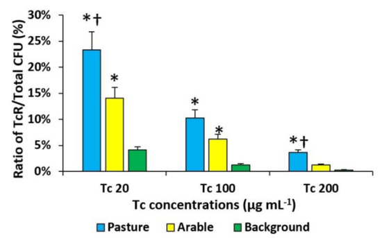 Mean ratios of AbR/total bacterial CFUs, on a range of Tc concentrations, for WRSS1. * p < 0.05 versus background; † p < 0.05 versus arable.