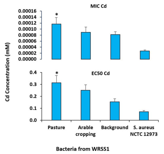 Samples of bacterial consortia isolated from the soil sample sets were subjected to PICT analysis for Cd (Figure 4), Zn and Hg (Figure S6) for WRSS1 and indicated MIC and EC50 values were significantly greater for TEoEC for consortia from pastoral soil compared to those from background soil.