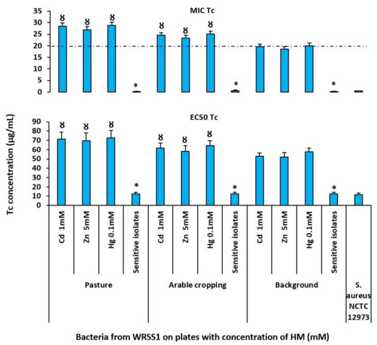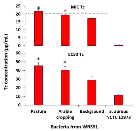 Mean MIC and EC50 values for broth microdilution assay with Tc for TEoECR isolates from WRSS1. * p < 0.05 compared to Tc MIC and EC50 values for TEoECR isolates from the same soil; Ȣ p < 0.05 compared to Tc MIC and EC50 values for isolates from background soil and selected on the same TEoEC concentration). The dashed line defines the Tc resistance level of soil bacteria.