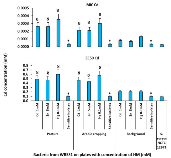 Mean MIC and EC50 values from broth microdilution assay with Cd for TEoECR isolates from WRSS1. * p < 0.05 compared to value for TEoECR isolates from the same soil; Ȣ p < 0.05 compared to value for TEoECR isolates from background soil.