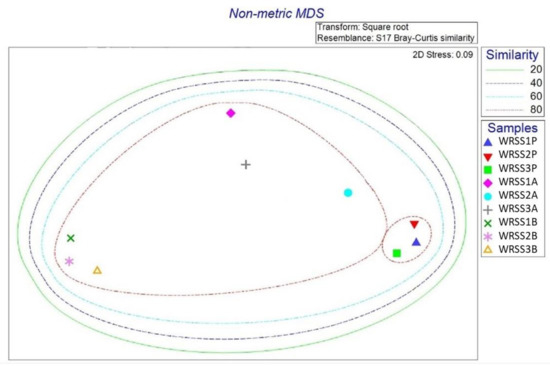 Non-metric multidimensional scaling analysis plot of TRFLP relative peak height for WR soils’ bacterial communities’ data, using the Bray-Curtis similarity index. Significant difference (p < 0.05) between the two clusters characterised with >80% of similarity.