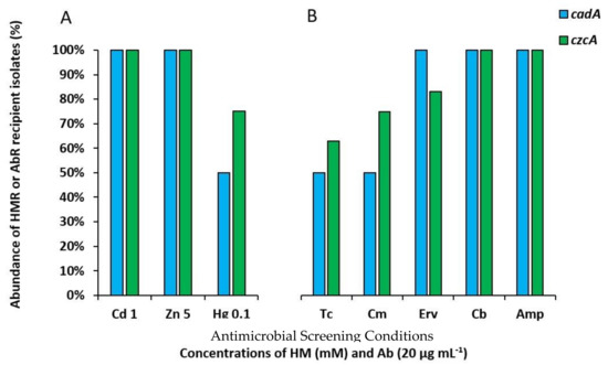 Percentage of transconjugant MUW001 carrying czcA and cadA genes resistant to (A) TEoEC (Cd 1 mM, Zn 5mM, Hg 0.1 mM) and (B) Ab (20 ug/mL).