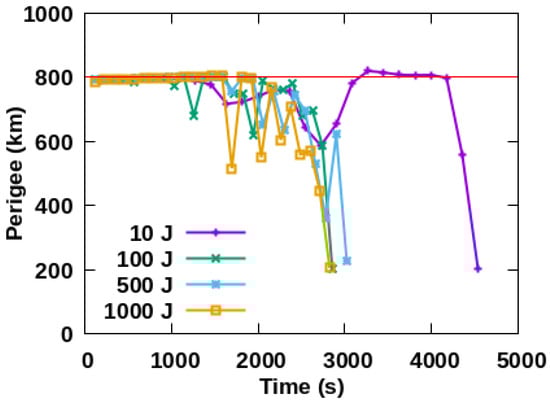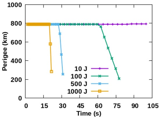 Figure 3. The perigee of space debris does not change significantly when irradiated by 10 J within 100 s. Perigee below 200 km allows for space debris to finally be removed within 76 s when irradiated by 100 J. However, space debris cannot be removed when irradiated by 500 J and 1000 J, even if the irradiation lasts almost 32 s and 22 s, respectively.
