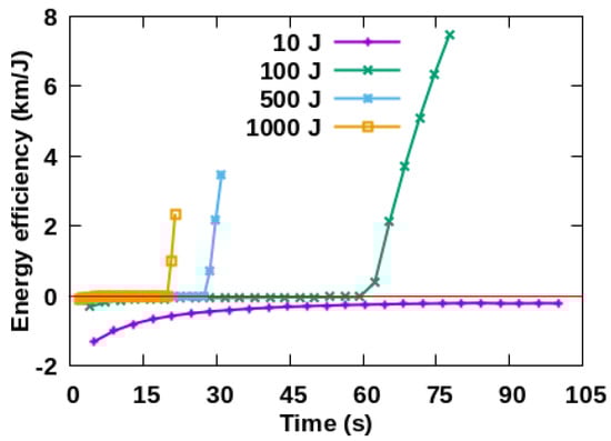 Figure 4. The energy efficiency gradually increased from −1.5 km/J to 0 km/J when laser energy is 10 J, which means the perigee of space debris is increasing. The energy efficiency gradually increased from −0.2 km/J to 7.8 km/J within 76 s when the energy is 100 J, from 0 km/J to 3.8 km/J within 32 s with 500 J and from 0 km/J to 2.9 km/J within 22 s with 1000 J respectively. The trend shows that lower laser energy means less energy efficiency in the initial state. A higher energy density would lead to a rapid increase in the energy efficiency. It indicates that a greater velocity increment is obtained by space debris under single driving with higher laser energy, which results in less time for space debris to be located in the laser range. The cumulative velocity increment gradually increases when it is driven by multiple times with lower laser energy, and the perigee changing per unit time is faster than before.