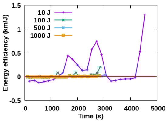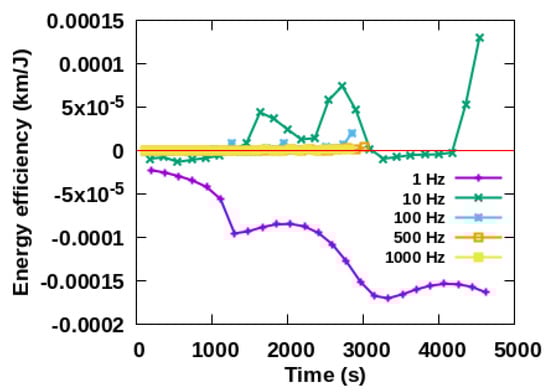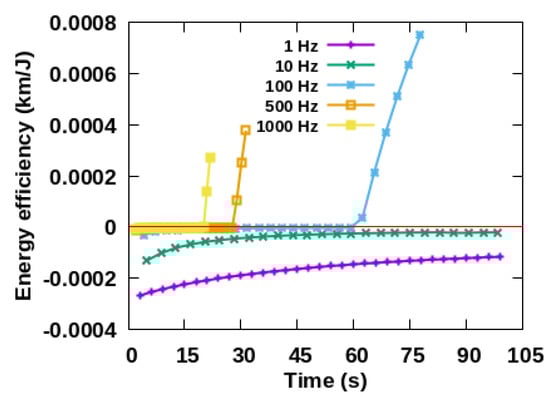 Figure 10. When the frequency is 1 Hz, the energy efficiency is negative and it increases gradually with time, indicating that the perigee is increased gradually with time. The energy efficiency oscillates around 0 km/J with time when the frequencies are 10 Hz, 100 Hz, 500 Hz and 1000 Hz, which are consistent with the downward trend of perigee oscillation in the