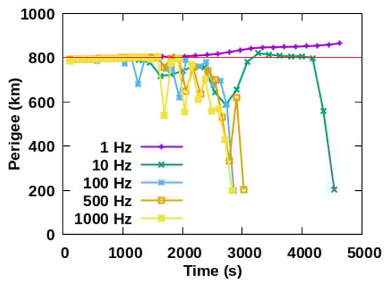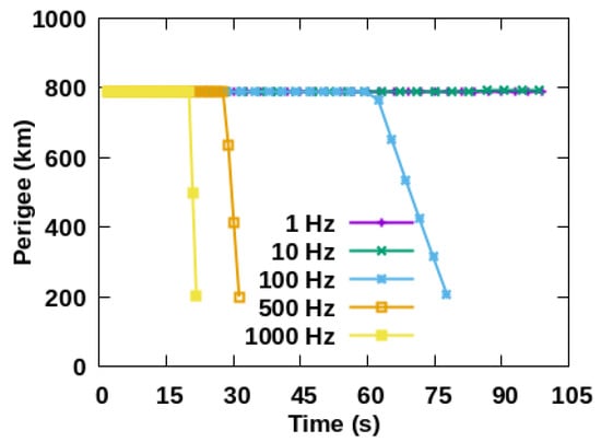 Figure 7. Space debris cannot be removed under the frequency of 1 Hz and 10 Hz. The perigee is at 198 km within 78 s with 100 Hz, 185 km within 31 s with 100 Hz and 199 km within 21 s with 1000 Hz.