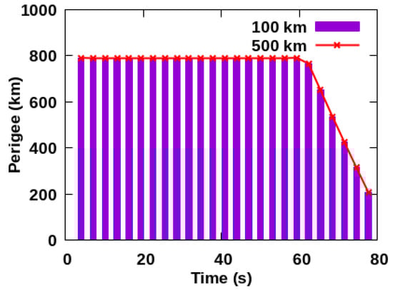 Figure 13. At the two states, the perigee of debris is decreased from 800 km to 195 km in 2800 s, and the change trend is completely the same. It shows that the laser range has no effect on the perigee change of debris.