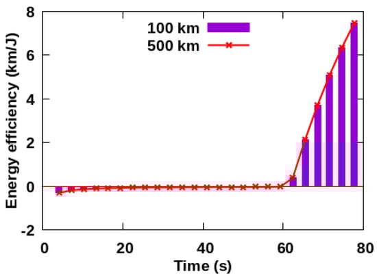 The energy efficiency with time in the removal range of 100 km and 500 km when the removal platform is coplanar with space debris is shown in