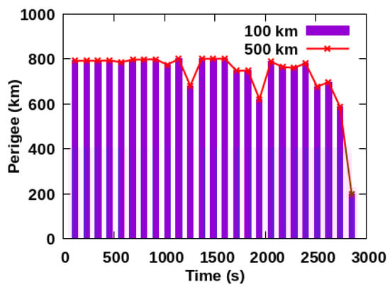 The perigee of space debris in the range of 100 km and 500 km when the removal system is coplanar with space debris is shown in