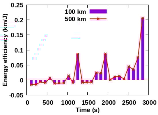 Figure 12. In the two removal ranges, both the energy efficiencies are gradually increased from −0.5 km/J to 7.5 km/J. The increase in time leads to energy efficiency increasing significantly, which is completely consistent with the results in