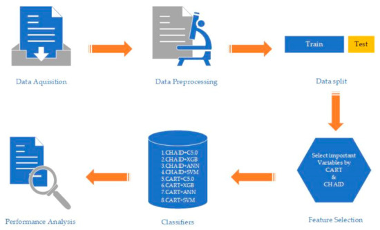 CART and CHAID are two technologies with very strong selection and classification abilities in decision tree algorithms. This study uses CART and CHAID as the tools to select important variables in the first stage, and then, four machine learning technologies with good learning and prediction abilities are applied, namely XGB, ANN, SVM, and C5.0, which are used to construct the going-concern prediction models. CART, CHAID, XGB, ANN, SVM, and C5.0 are widely used in machine learning technologies with strong classification abilities.