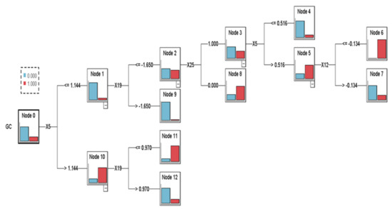 According to Table 5, further comparison of the test group of the CART–C5.0 model shows that the proportion of GCD samples mispredicted as Non-GCD samples in the total samples is the lowest (3.01%). According to Table 6, in the CHAID–C5.0 model test group, the proportion of GCD samples mispredicted as Non-GCD samples in the total samples is also the lowest (1.24%). In addition, regarding the prediction models constructed using C5.0 as a classifier, both the CHAID–C5.0 model (the accuracy of the test group is 95.65%), which is constructed to be used with CHAID for variable selection, and the CART–C5.0 model (the accuracy of the test group is 92.77%), which is constructed to be used with CART, performed well. In the test group, the proportions of GCD samples mispredicted as Non-GCD samples in the total samples are 1.24% and 3.01%, which are stable.