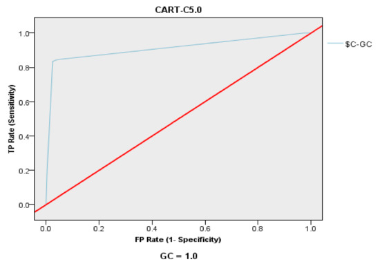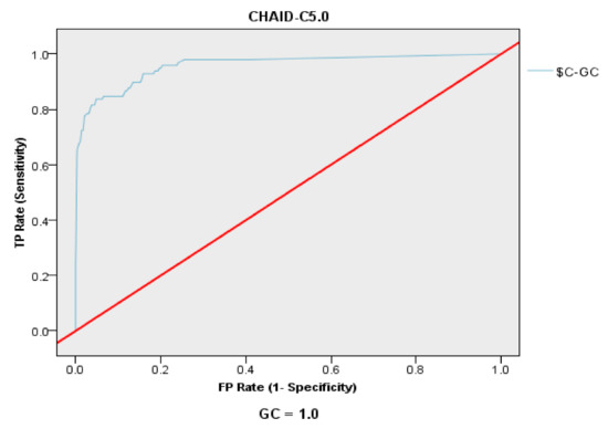 Finally, the ROC curve and AUC value are also adopted to compare the CHAID–C5.0 and CART–C5.0, as shown in Figure 3, Figure 4 and Table 8. The results also show that the CHAID–C5.0 model (AUC value: 0.957) is better than the CART–C5.0 model (AUC value: 0.912).