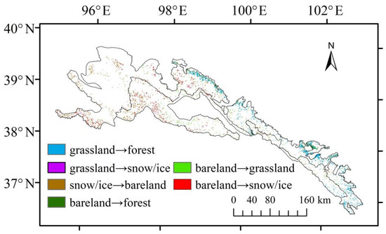 Combined with Figure 4 of the spatial distribution of land cover transfer from 2018 to 2050, it can be seen that due to the large area base of grassland and bare land types, the conversion of grassland types and bare land types in the QLME is quite obvious. Among them, in the central and eastern regions of the QLME, a large amount of grassland was converted to woodland. In addition, the bare land in the QLME has been largely restored to woodland and grassland, and the area of vegetation land types has increased significantly. However, in the western high altitude area of the QLME, the exchange of bare land and glacial snow cover land was mainly manifested, as well as the restoration of glacial snow cover land and bare land to grassland. Most of them were scattered alpine meadows and low coverage grassland. Overall, the spatial change of the land-use in the QLME will develop well from 2018 to 2050, and the area of forest land will increase.