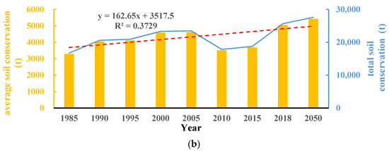 Changes of soil conservation in the QLME from 1985 to 2050 ((a): RCP4.5 scenario, (b): RCP8.5 scenario).
