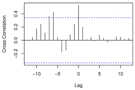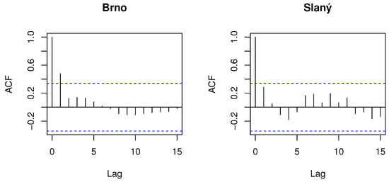 Similar to , the cross-correlation function () measures the correlation for a certain value of lag, but this time between both time series. As seen in Figure 3, in our case points to a moderate degree of correlation between data in Brno and Slaný. At the same time, it also shows a moderate degree of correlation for about half a year of the “lagged” Brno series with the series in Slaný.