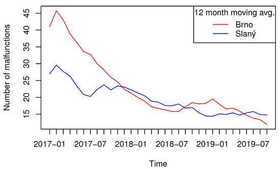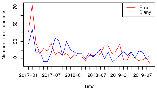 As Figure 5 shows, the trend is similar in both cases—decreasing—although we can see that it has more or less stagnated in Slaný from the beginning of 2019, while a downward trend can still be seen in Brno. Similarly, a more pronounced decrease can be observed from linear regression, i.e., approximation of data in form of in the sense of quadratic norm. The linear component for Brno data equals −0.679, whereas in Slaný it is only −0.347, nodding towards a more significant decrease in Brno. This is, among other possible causes, due to a different dominant type of malfunctions in both APSs, see the following section.
