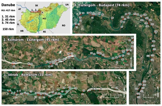 The Danube enters the Carpathian basin at Devin (Slovakia). The velocity of the stream slows down and creates a special inner delta in the Szigetköz (Hungary)—Žitný ostrov (Slovakia) region. After the mouth of the Mosoni Danube branch, the riverbed is more stable; therefore, we started our studies from this site, i.e., Vének (1797 river kilometre = rkm) (Figure 1), and moved along the main Danube stretch towards Budapest (1647 rkm). We divided this 150 rkm long stretch into three sections as it is also used in mapping sources.