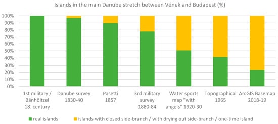 Altogether, 123 islands can be counted on the 150-rkm long observed Danube stretch. It is important to consider that all of these islands never existed together, but each of them was a real island during a shorter or longer period between the 18th and 20th centuries. In order to avoid misunderstandings, we compiled the results of our landscape historical investigations to present the rate of real islands compared to the other groups (i.e., islands with closed or drying out side-branch and one-time islands that became part of the riverside) at each period (Figure 2). Due to the varying aim and detailedness of each mapping, and the complexity of the changes (formation, disappearance, merging), the results only allowed us to show the trends, the directions of processes, differences among ratios, and periods of serious changes.