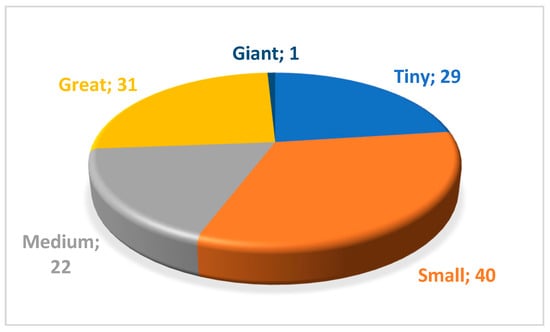There are considerable differences in the size of the islands (Figure 4). However, due to river dynamics, the size of an island is a snapshot value; therefore, we applied the following size categories, which were measured on the latest map when the island was delineated as real: Tiny (0.1–1 ha); Small (1–5 ha); Medium (5–15 ha); Great (15–1000 ha); Giant (1000+ ha). 53 of the 123 islands are medium or great sized, which can be permanently followed during the history, we call them as “stable” islands. 40 islands were categorized as small and 29 as tiny. The tiny ones are usually established around the great islands, or behind regulation structures, and are usually short-lived as real islands.