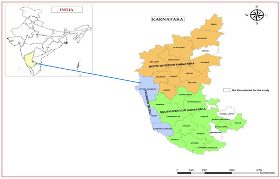 India is one of the largest agrarian countries, and the development of the agricultural sector is quite challenging with many issues. India has the largest area of rainfed dryland agriculture globally, with a variety of distinct types of farming systems producing most of its coarse cereals, food legumes, minor millets, and a large number of livestock [14]. Significant socio-ecological challenges overlap in these landscapes: endemic poverty, malnutrition, and land degradation [14]. Addressing these challenges is vital for national and regional food and nutritional security. Sub-optimal growth, poor or a lack of income generation, and the relocation of farmers to other livelihood activities other than agriculture are the signs of the degradation of natural resources and the weakening the socio-economic status of farmers [15]. Karnataka is the state in India with the second largest extent of agriculture coming under rainfed conditions, and the growth is affected by the quantum variability and distribution of rainfall received during the monsoon season. The agriculture sector offers the largest source of employment and is the prime source of income for the farming households of Karnataka. The contribution of agriculture towards Karnataka state’s gross domestic product in absolute terms is ever increasing and significant, while a declining trend has been observed in relative terms compared to manufacturing and service sectors [16]. Although the per capita income has increased significantly because of an expansion in the manufacturing and service sectors in Karnataka, the per capita gross domestic product (GDP) from agriculture has remained low in rural areas, with widening inter-sectoral inequities [16]. More than half of Karnataka’s workforce brings in less than one-fifth of the GDP, due to the low productivity of labor in the agricultural sector. This has major ramifications for the well- being of the rural population and poverty alleviation [16].