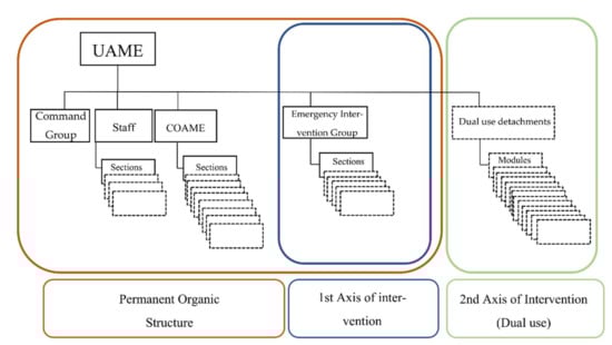 In Figure 3, it is possible to identify the UAME’s organic framework. It is worth noticing that it complies with a Command Group, General Staff, Emergency Military Support Operations Center, Emergency Intervention Group and Dual Use Detachment. The Emergency Intervention Group is the structure, with resources exclusively dedicated to the EMS. Subsequently, the UAME has a flexible structure that can be adapted to the specificity of each mission—which is the same to say that the Dual Use Detachment has competences in the field of fighting rural fires, search and rescue, and surveillance, among others. In short, the UAME’s structure is essentially based on two axes, the 1st axis consisting of a minimum permanent service support structure, and the 2nd axis is reinforced by additional means, depending on the type of mission.