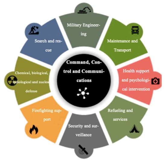 In addition, the Portuguese Army Emergency Military Support Plan (PAMEEX) aims to establish the rules under which the Military Support for Civil Emergencies act [56]. The purpose of PAMEEX is to establish the form of collaboration with the Army regarding the prevention and response to complex emergencies. In that regard, PAMEXX addresses the UAME’s EMS capabilities, which were the result of the 2014 Forces System implementation, and which are organized in nine areas of activity (Figure 4). These nine areas of intervention are focused on several intervention responses to crises, such as extreme events caused by terrorist attacks, forest fires, floods, earthquakes, and volcanic eruptions, among other crises. Although not exclusive, the UAME’s area of activity is focused on the prevention and action against events originating from natural causes. The selection of these events is in accordance with the reports presented by the UN (see Figure 1 and Figure 2).
