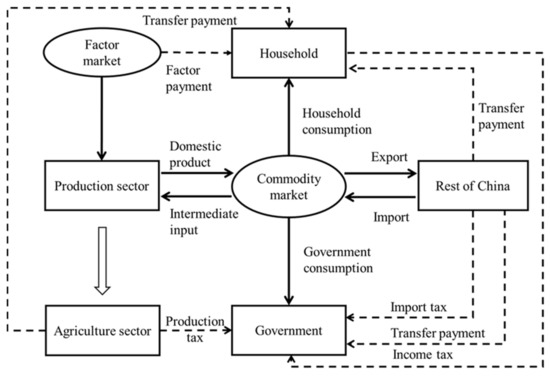 To gain a unique solution, the CGE model needs to set the micro-closure and macro-closure to ensure that the constraining conditions are consistent with the number of endogenous variables. We obtain the equilibrium price under market equilibrium conditions, which represents the solution of the nonlinear equation system. The nonlinear equation system includes the intermediate and final demand equations, the expenditure and income equations of households and the government, savings and investment equations, and trade balance equations. We used neo-classical closure, setting closures in the commodity markets, the factor markets, institutional income and expenditure, trade markets, and investment savings.