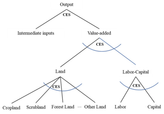 The production module describes the relationship between factor inputs and domestic outputs. According to the substitution relationship between inputs, it is usually divided into three categories: Leontief production technology, Cobb–Douglas production technology, and constant elasticity of substitution (CES)production technology. This model assumes that the market is completely competitive and that production decisions are made following the principle of cost minimization. To reflect and solve the more complex substitution relationship between multiple inputs, the production module uses a multi-level nested form (See Figure 2). The intermediate input and compound factors (value-added) solve the first level of nesting through the CES function. The second layer comprises the following two parts. The first part is the compounding of intermediate inputs through the Leontief (LT) function, and the second part is the compounding of capital, labour, and land factors through the CES function.