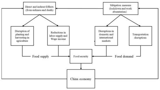 The cumulative impact of the COVID-19 epidemic has put the entire world under threat of food security and nutritional deficiencies, particularly in countries with large populations [49]. As the world’s largest food consumer, China continues to hold a leading position in the global food supply chain [50]. In order to prevent the large-scale spread of the epidemic, the Chinese government has implemented a strict lockdown policy since the outbreak of COVID-19 to restrict the mobility of people. COVID-19 and its mitigation measures have affected agriculture in the following two relevant aspects: the supply and demand for food (See in Figure 3). On the one hand, direct and indirect effects of sickness and death have caused a reduction in labour supply and wage income, thus disrupting the planting and harvesting of agricultural commodities. On the other hand, these restrictions lead to a lag in the transportation of agricultural products. A sudden decline in the demand for agricultural products resulted in a large amount of unsellable seasonal perishable vegetables and fruits due to the closure of local restaurants and markets [51]. If such problems cannot be properly resolved, farmers will not be able to receive any profit from the current harvest (i.e., foods are backlogged in the farmland and will not even be picked), causing lower reinvestment in the next spring’s planning.
