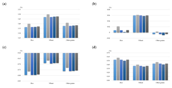 First, COVID-19 has had major negative impacts on China’s food security in the short term. The output of rice, wheat, and other grains in 2020 decreased by 1.89%, 2.08%, and 0.93% annually compared with non-COVID. The loss is more severe than that in the conclusions of NHC [54], since they only studied the impact of epidemic-affected labour shortages without the loss of productivity. Moreover, without external shocks (such as government subsidies, food policies, technical support, etc.), the epidemic’s impact on China’s food security indicators will continue for 3–5 years.