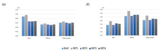It is necessary to study the mitigating effects of technological progress on food insecurity caused by COVID-19 and explore more targeted food security countermeasures. For example, in Figure 4a, under the implementation of labour-saving technological progress (Scenario SET1), the average annual growth in output of rice, wheat, and other grains in the short term is 3.40%, 3.49%, and 3.41%, respectively. In the SET3 scenario, the results are very similar to those of SET2. Labour-saving progress (SET1) appears to lead to a greater increase in food production than capital-saving and land-saving progress (SET2 and SET3) in Figure 4b,c,e,f. This result is consistent with Antonelli and Quatraro [58]’s opinion that factor-saving technological progress that matches the factor endowment structure can enhance agricultural output and TFP. China’s farming area is smaller than that of some developed countries, such as the USA and France, but has a larger population. Hence, labour-saving technological progress can lead to higher marginal outputs. However, we can see from Figure 4d, that the average annual growth in rice prices is 0.57% in the short term.
