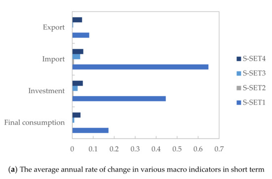 Macro effects under the four types of technological progress compared with BAU. (a) The short term refers to 2020 to 2022. (b) The long term refers to 2020 to 2030.