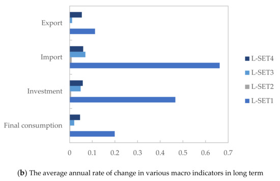 As shown in Figure 5, technological progress increased imports and exports, especially labour-saving technological progress. In the short term, compared with the BAU scenario, imports increased by 0.65% annually and exports increased by 0.08%. In the long run, imports and exports increased by 0.66% and 0.11%, respectively. Due to technological progress in the agricultural sector, the grain produced in China will be more competitive with the same goods in the international market, resulting in a decrease in import demand. However, the results show that all four types of technological progress would increase total imports. The reason may be that the cost reductions brought about by technological improvements would lead to an expansion of production, which would require more intermediate inputs. To meet the input needs of production, the demand for imports may increase.